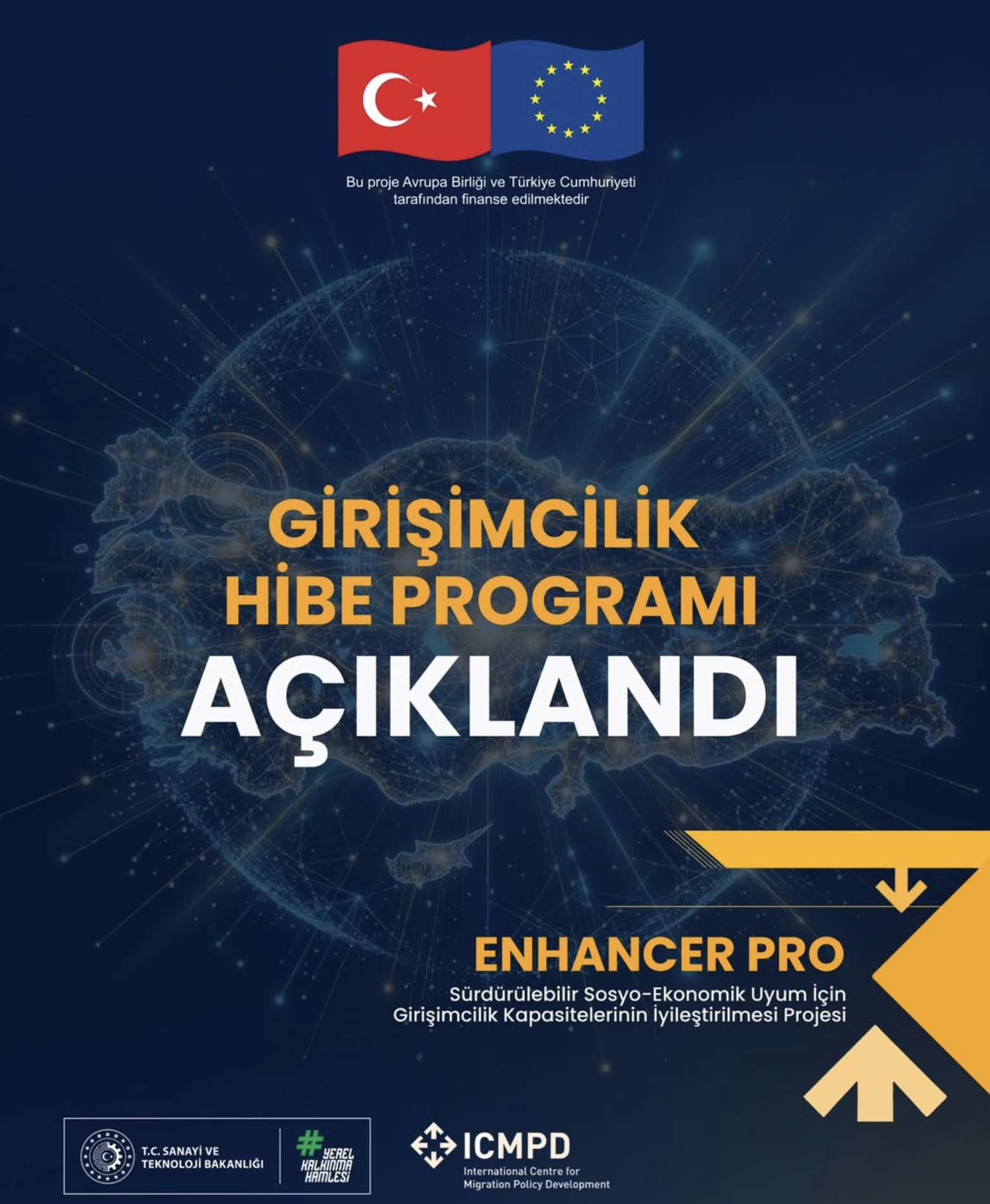 Avrupa Birliği finansmanıyla, T.C. Sanayi ve Teknoloji Bakanlığı Kalkınma Ajansları Genel Müdürlüğü ile Uluslararası Göç Politikaları Geliştirme Merkezi (ICMPD) iş birliğinde yürütülen ENHANCER PRO Projesi kapsamında Girişimcilik Hibe Programı ilan edilmiştir.